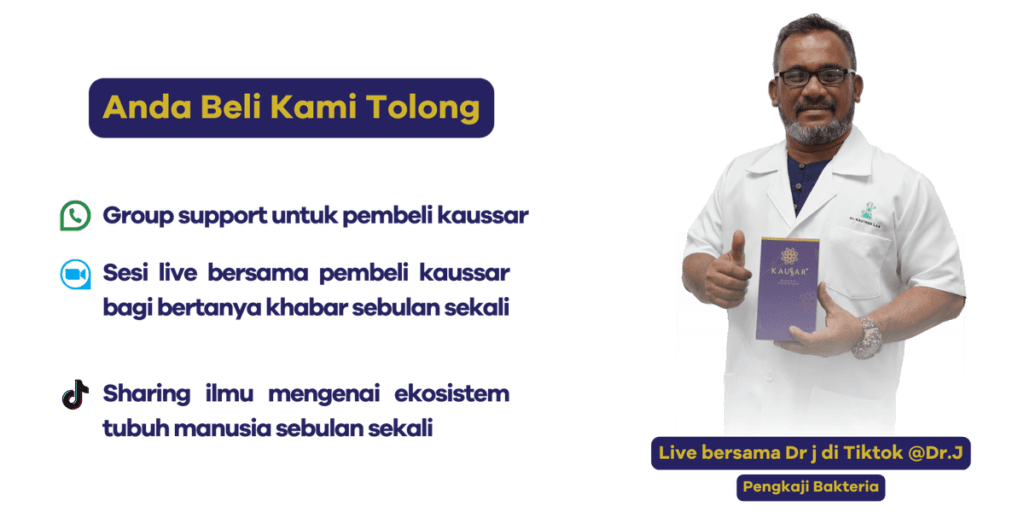 Polisi Pemulangan Wang: Pulangan Wang Akan Diberikan Sekiranya Tiada Sebarang Perubahan Setelah 60 Hari Amalkan KAUSSAR Secara Konsisten & Amalkan Sekurang-Kurangnya 1 Cup Prebiotik, 1 Cup Probiotik sehari.